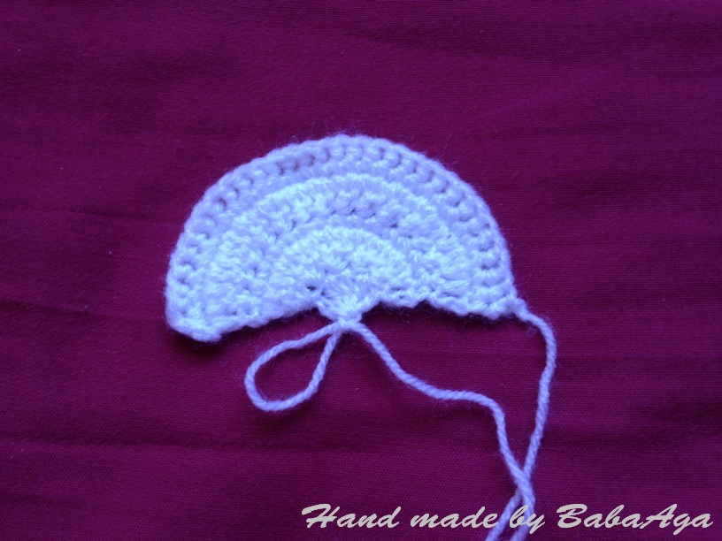 Białą włóczką robimy30 półsłupków (znów posłużyłam się tym sposobem). Następnie przerabiamy wg niebieskiej części schematu: